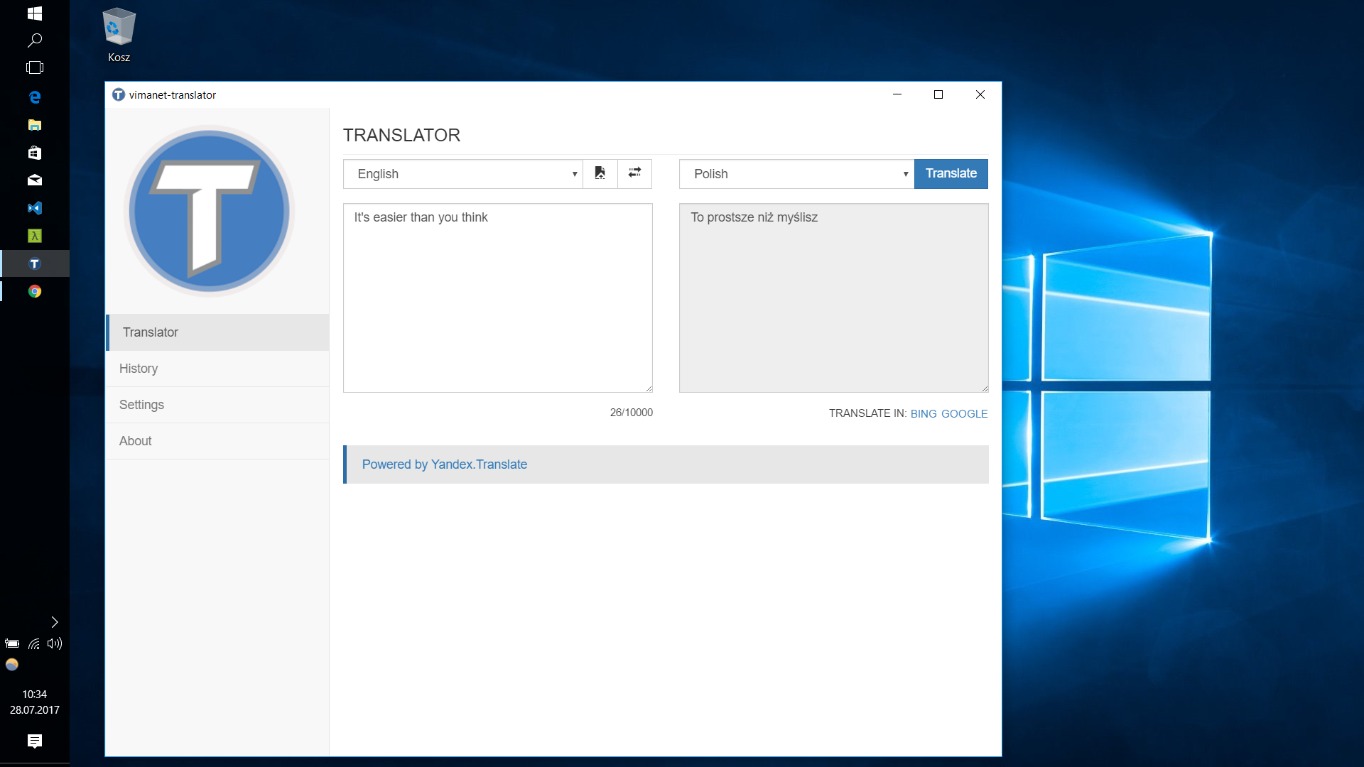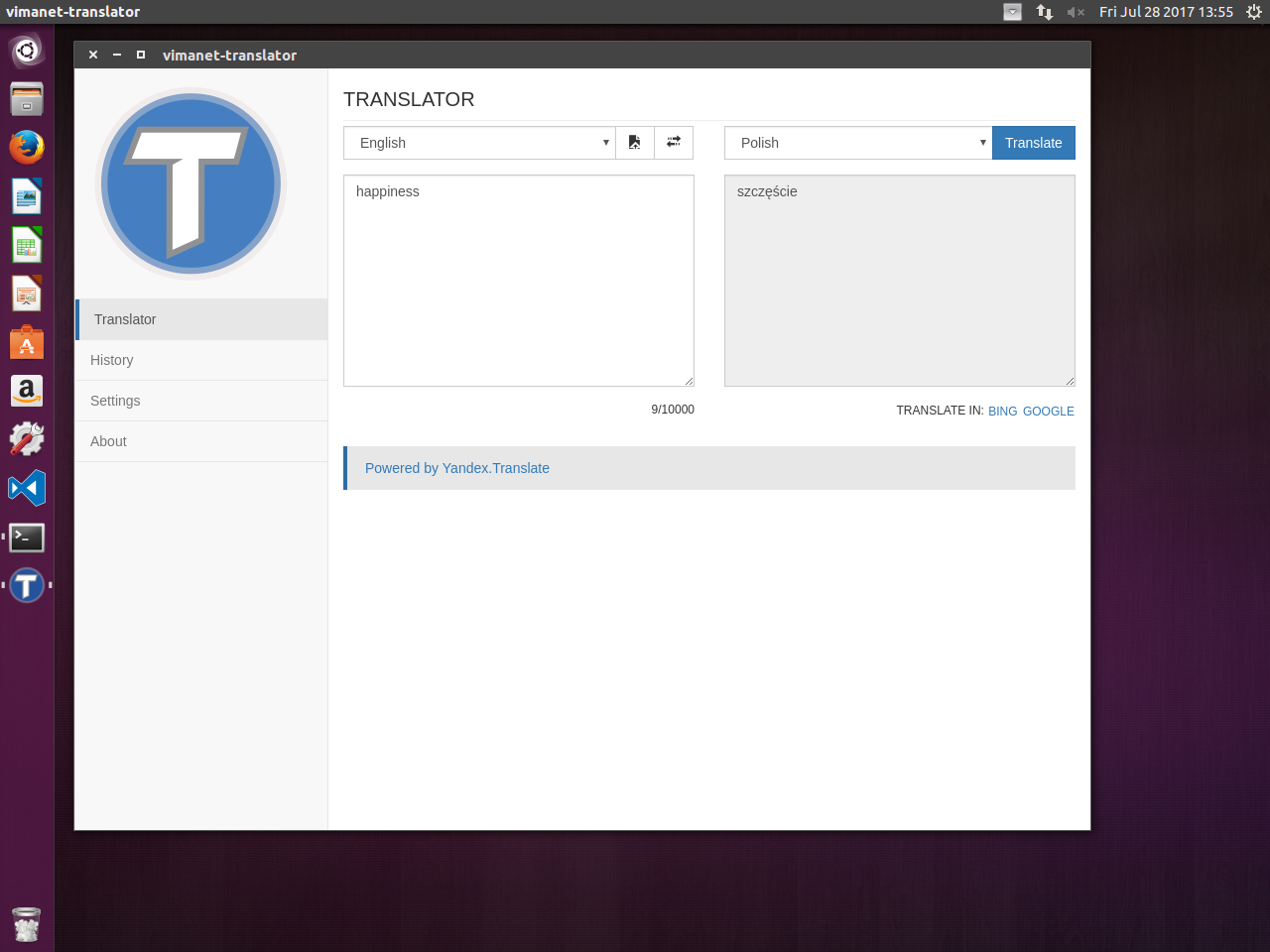We decided to use Angular 2 template because there was no template for Angular 4. Translations are done by Yandex translate API (free one). But if you are after a paid and higher quality translations you can easily make your own provider for Microsoft Translator Text API or Google Cloud Translation API. In addition, user can translate his/her text(s) in Bing Translator or Google Translate website from our app :)